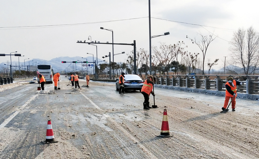 裕升、裕欣、裕祥三家養(yǎng)護公司組織綠化、保潔人員配合除雪車、裝載機等機械設備對花果山大道、黃海大道、東方大道、242省道、新光路及大浦路等主干道進行清雪作業(yè);對程圩橋、先鋒大橋等橋面易積雪路段以及馬山路立交、新光路涵洞等“上跨下穿”路段采用撒氯化鈣的方式,加速積雪融化,并安排人員及時掃除積雪,防止路面因低溫降雪產生冰凍,對交通安全造成影響;對創(chuàng)智綠園廣場、火車站廣場及匝道等窗口地段采用人機結合的形式清掃積雪。盛達市政公司、瑞泰服務公司及益豐園林公司在提供鏟車、平板車、裝載機等機械車輛配合掃雪的同時,積極做好后勤服務,為清雪工作有序開展提供保障。截至到中午,各條主干道積雪已基本清理完畢,道路恢復暢通,保障居民出行和交通安全。